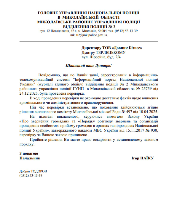 Відповідь поліції підприємцю Документ надав Дмитро Терлецький