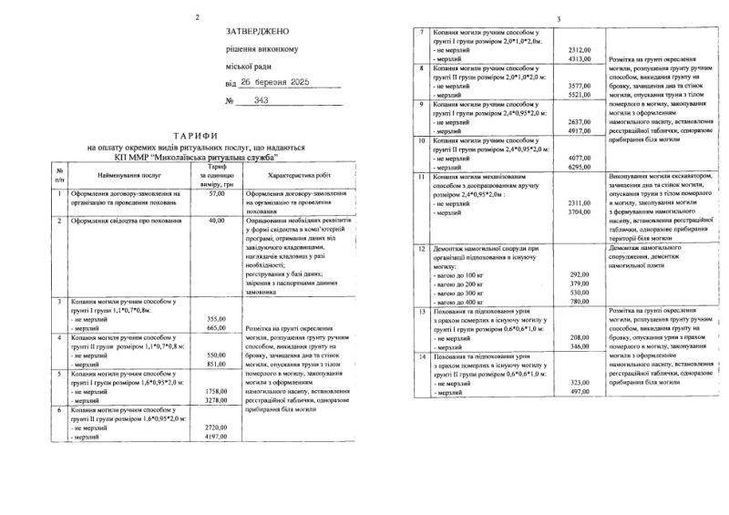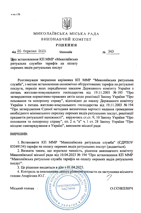 КП "Миколаївська ритуальна служба" надає платні послуги відповідно до рішення виконавчого комітету міськради від 26 березня 2025 року, говорить його директор Сергій Васелега. У цьому рішенні встановлені тарифи на послуги.