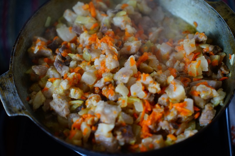 На пательні обсмажують нарізане кубиками сало, додають м’ясо та овочі.