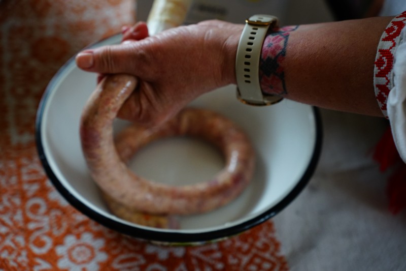 "Тут у нас м’ясна ковбаса, пшоняна ковбаса, карасі посолені й залиті сметаною. І тут у нас теж етнічна, дуже гарна страва — вона називається "капуста". Тут є м’ясо, капуста мелена, картопля давлена, зажарки, пшоно", — розповідає жінка.