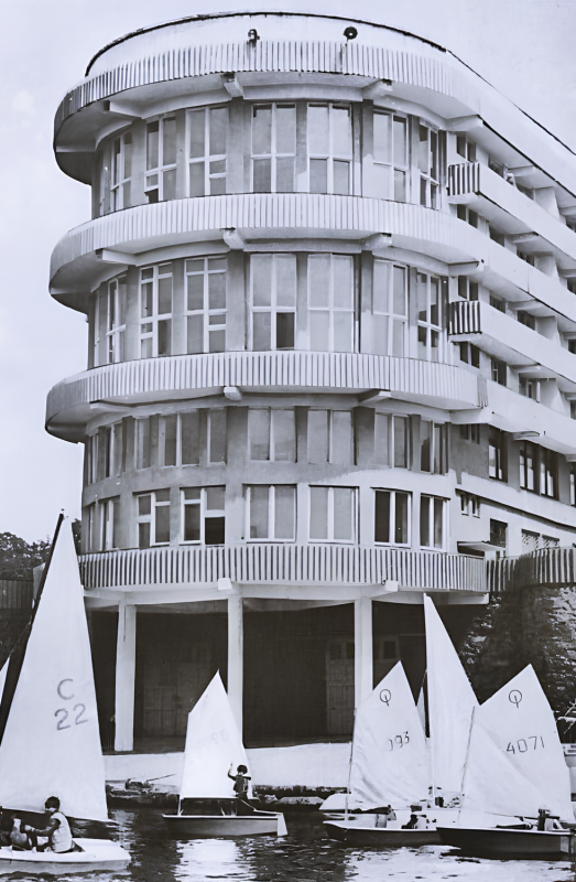 "На першому поверсі було лікувальне відділення, ще на чотирьох поверхах — стаціонарне відділення. Під цокольним поверхом, напівкруглою стороною будівлі, зверненою до річки і корабля, що символізує ніс, був елінгспоруда, призначена для побудови, зберігання та ремонту для човнів. Також там розташовувався басейн, пляж, літня тераса, дитячий майданчик та тенісний корт", — говорить Хворостянюк.