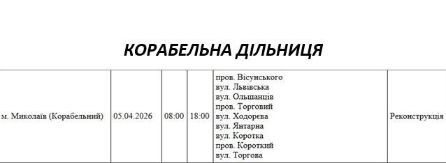 Графік планових робіт у Корабельній дільниці, 5 квітня АТ «Миколаївобленерго»
