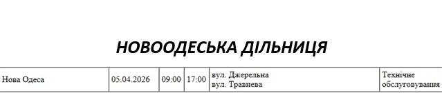 Графік планових робіт у Новоодеській дільниці, 5 квітня АТ «Миколаївобленерго»