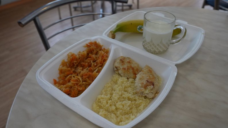 У денному шкільному меню — булгур, курячі котлети, тушкована капуста, кефір та банани. Однокласник Софії, Ілля, говорить, що зараз до школи привозять теплу їжу, хоча на початку були проблеми.