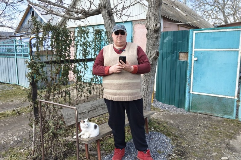 Місцевий житель селища Засілля Юрій Пісаревич користується інтернетом через Wi-Fi-роутер на телефоні, щоб читати новини та спілкуватися з дітьми у відеорежимі.