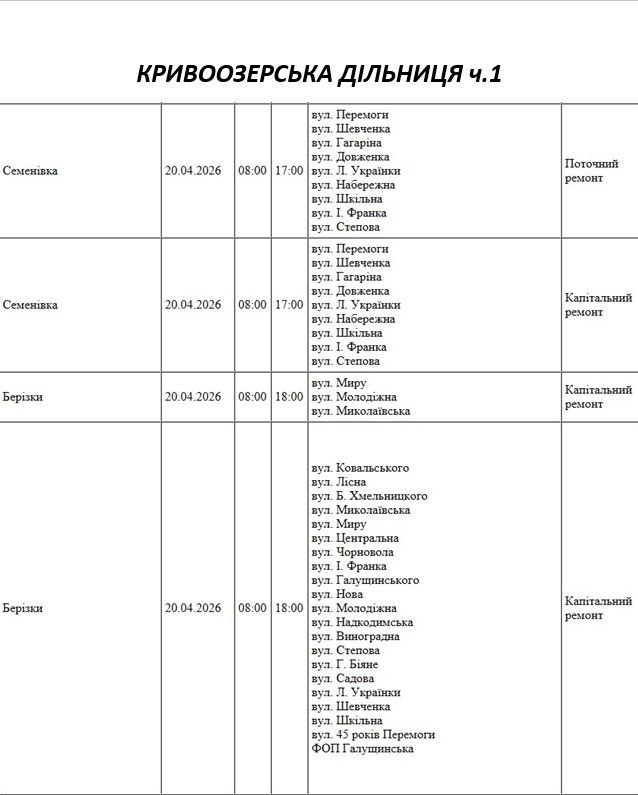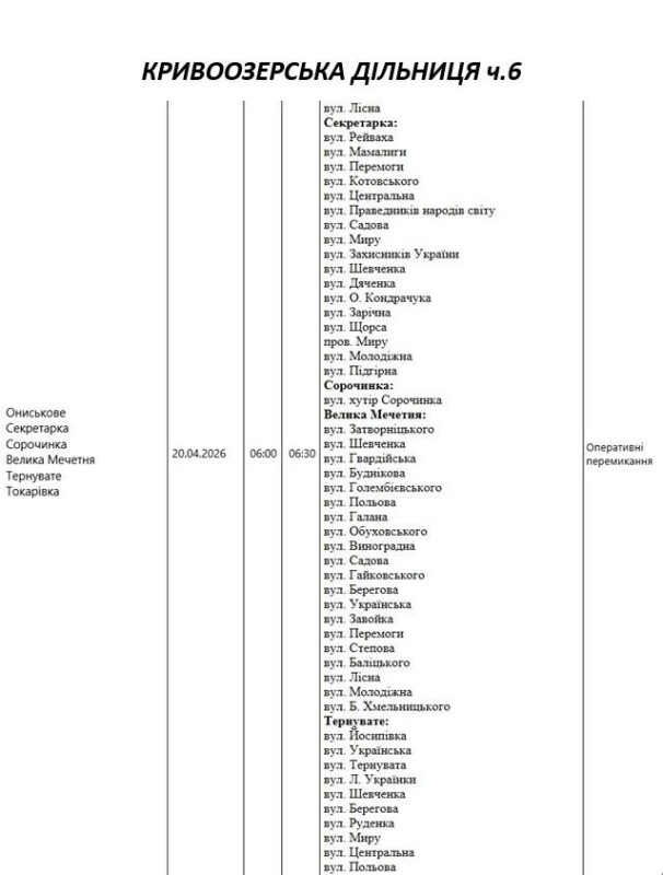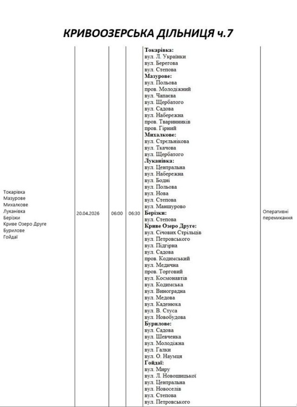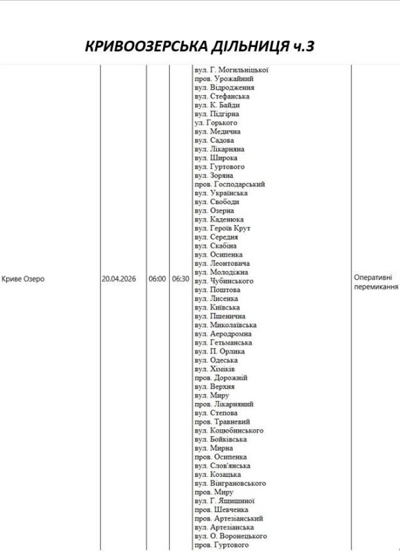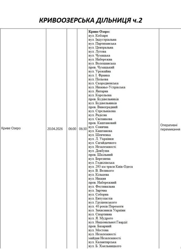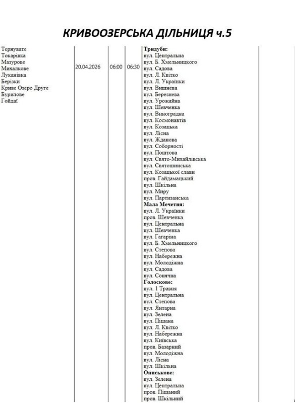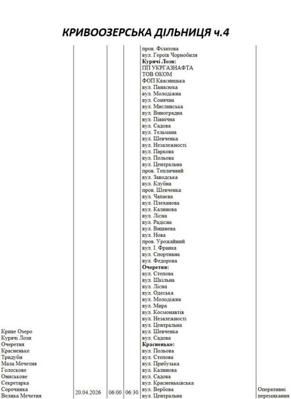 Графік відключення світла по адресах 20 квітня, Кривоозерська дільниця АТ «Миколаївобленерго»