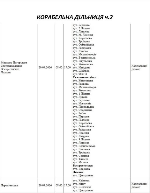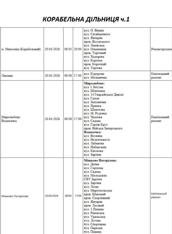 Графік відключення світла по адресах 20 квітня, Корабельна дільниця АТ «Миколаївобленерго»