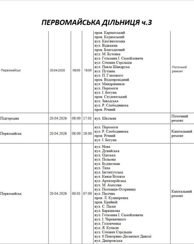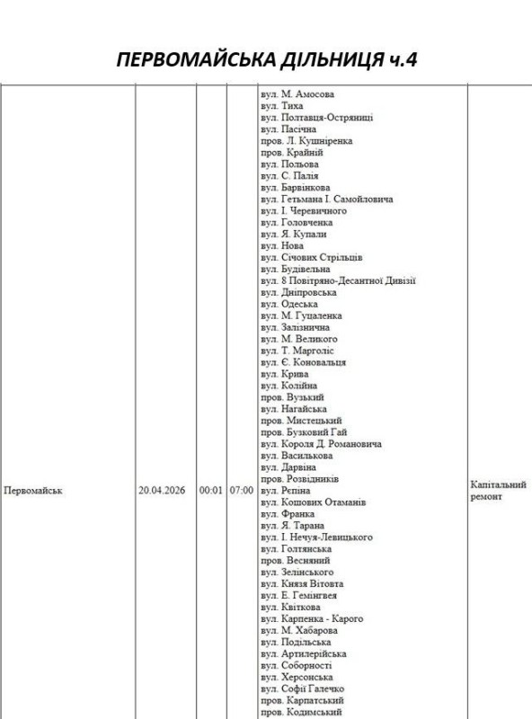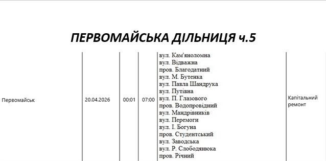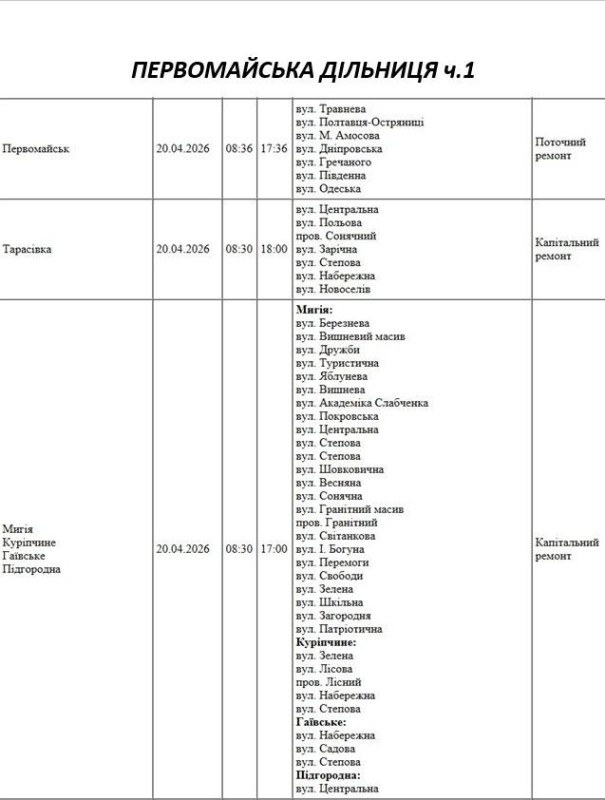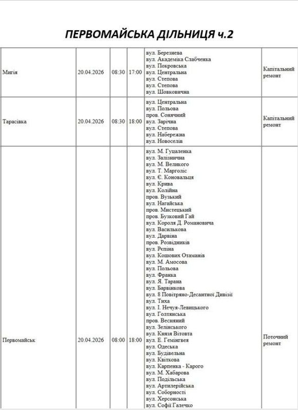 Графік відключення світла по адресах 20 квітня, Первомайська дільниця АТ «Миколаївобленерго»