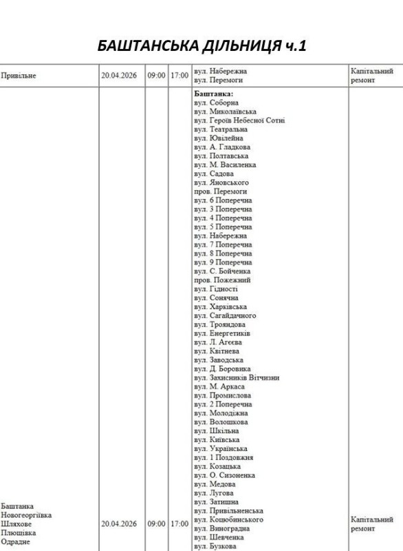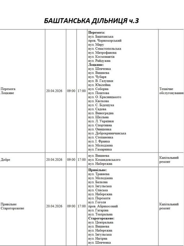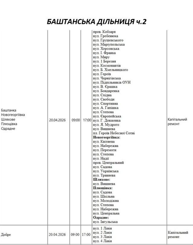 Графік відключення світла по адресах 20 квітня, Баштанська дільниця АТ «Миколаївобленерго»