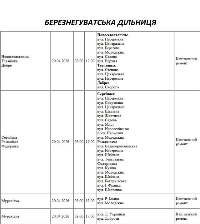 Графік відключення світла по адресах 20 квітня, Березенгуватська дільниця АТ «Миколаївобленерго»