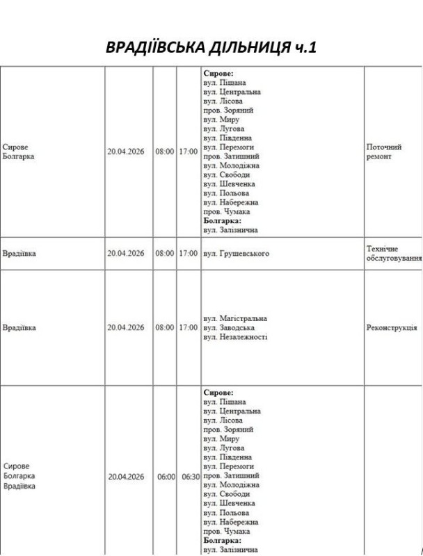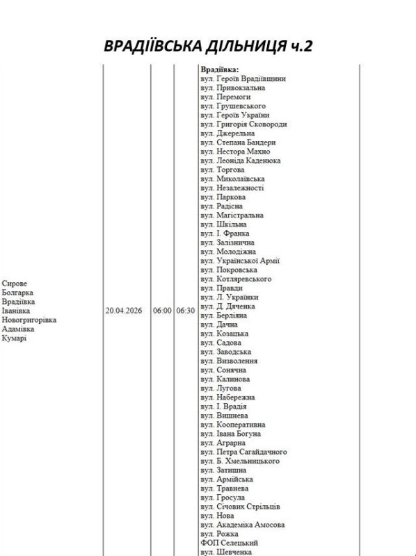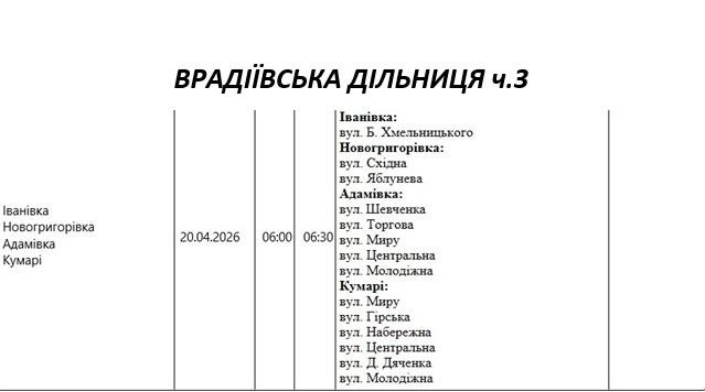 Графік відключення світла по адресах 20 квітня, Врадіївська дільниця АТ «Миколаївобленерго»