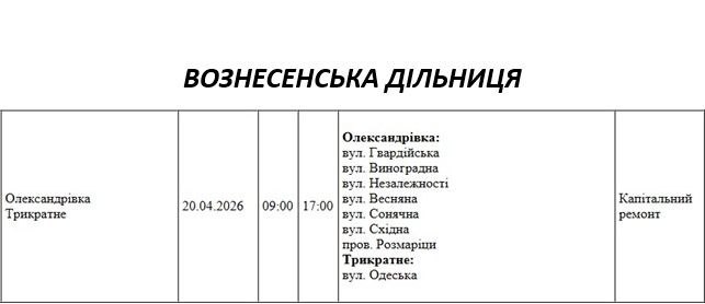 Графік відключення світла по адресах 20 квітня, Вознесенська дільниця АТ «Миколаївобленерго»