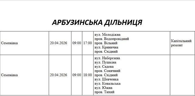 Графік відключення світла по адресах 20 квітня, Арбузинська дільниця АТ «Миколаївобленерго»