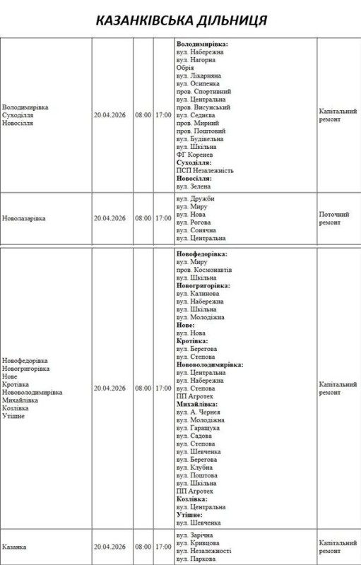 Графік відключення світла по адресах 20 квітня, Казанківська дільниця АТ «Миколаївобленерго»