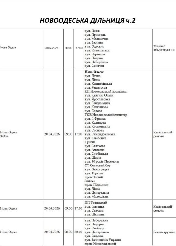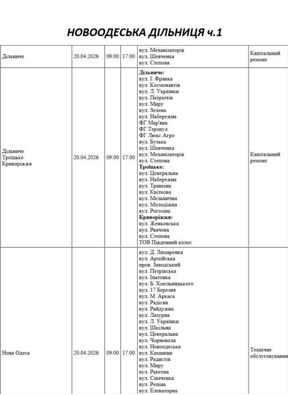 Графік відключення світла по адресах 20 квітня, Новоодеська дільниця АТ «Миколаївобленерго»