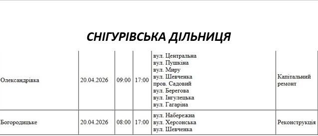 Графік відключення світла по адресах 20 квітня, Снігурівська дільниця АТ «Миколаївобленерго»