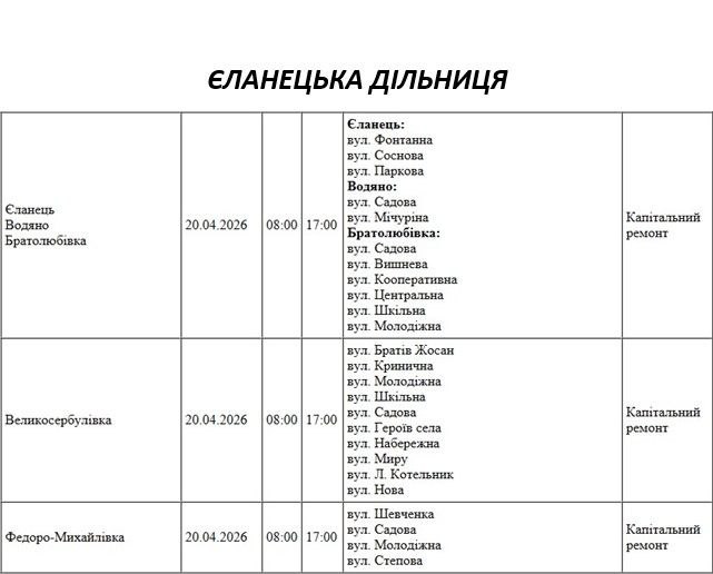 Графік відключення світла по адресах 20 квітня, Єланецька дільниця АТ «Миколаївобленерго»