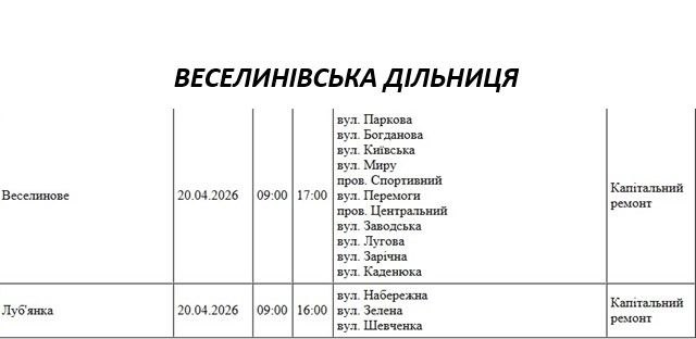 Графік відключення світла по адресах 20 квітня, Веселинівська дільниця АТ «Миколаївобленерго»