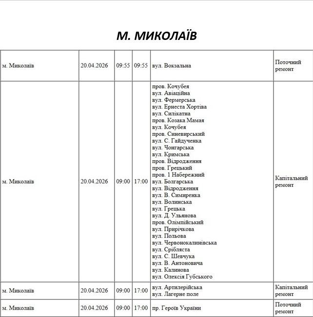 Графік відключення світла по адресах 20 квітня, Миколаївська дільниця АТ «Миколаївобленерго»