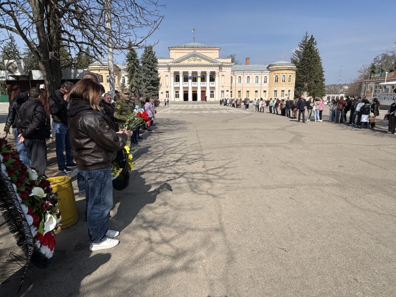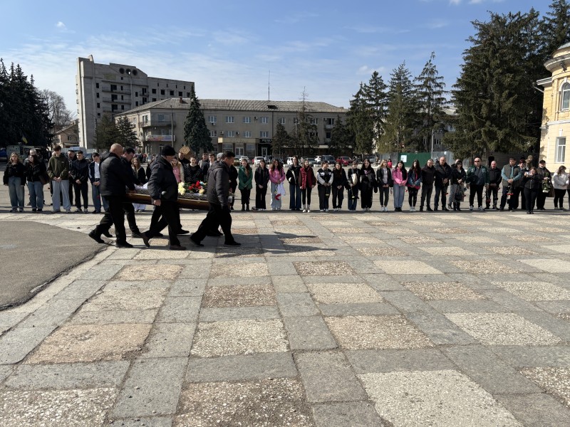 На центральній площі імені Тараса Шевченка у Первомайську провести в останню путь прийшли побратими, військовослужбовці, жителі та місцева влада.