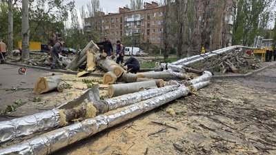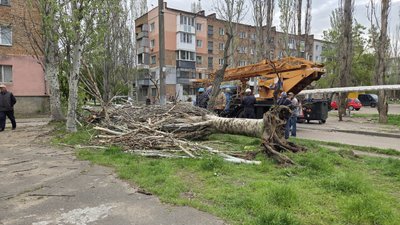 Комунальні служби розпилюють повалені дерева, що впали під час сильного вітру на теплотрасу. Суспільне Миколаїв/Маріетта Мкртчян