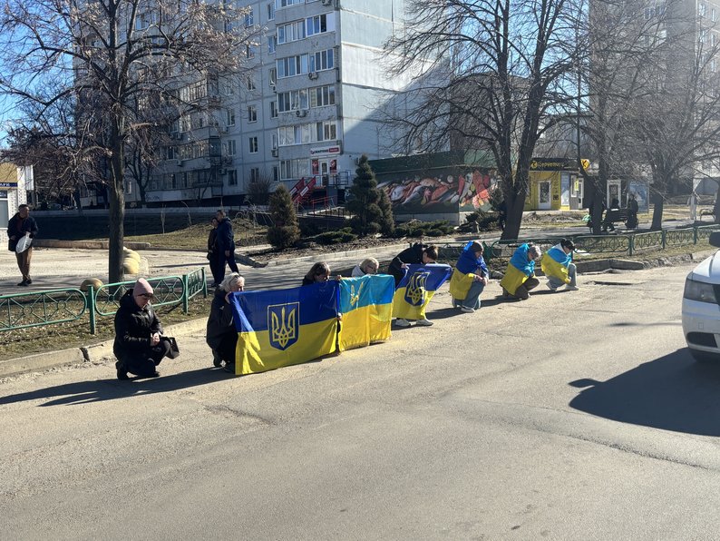 Люди стоять на колінах, проводжаючи загиблого військовослужбовця Валерія Козака. Суспільне Миколаїв