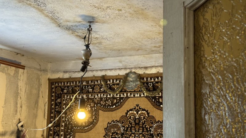 "Ось дивіться — горища немає. Сніг — воно по стінах тече, дощ так само — воно по стінах тече. Оце в нас таке світло. Все ж пообламувалось, порозбивало. Дивіться — стеля. Ніхто нічого не робить", — розповідає Надія.