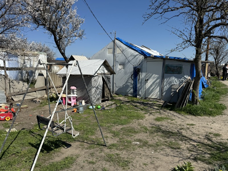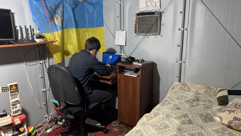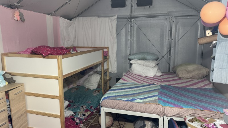 "Ми з будинку зняли ванну, поставили, там у нас пралка — те, що залишилось у нас з будинку. Тут у нас дівчинка навчається, тут хромбук Тип ноутбука, який працює на операційній системі Chrome OS від компанії Google.— це все її місце. А хлопчик тут у нас навчається. І спимо тут всі в одній кімнаті. Ось модульний будинок. А це вже все прибудували. З того, що було, будинок розібрали самі, і так чоловік зліпив", — розповідає жінка.
