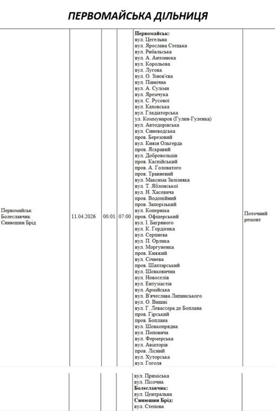 Графік відключення світла по адресах 11 квітня, Первомайська дільниця. АТ «Миколаївобленерго»
