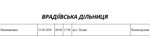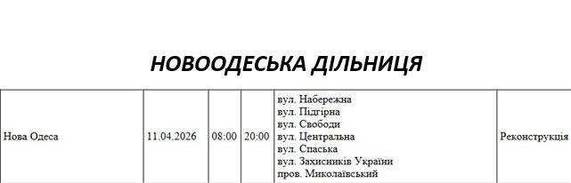 Графік відключення світла по адресах 11 квітня, Новоодеська дільниця. АТ «Миколаївобленерго»