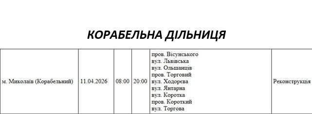 Графік відключення світла по адресах 11 квітня, Корабельна дільниця. АТ «Миколаївобленерго»