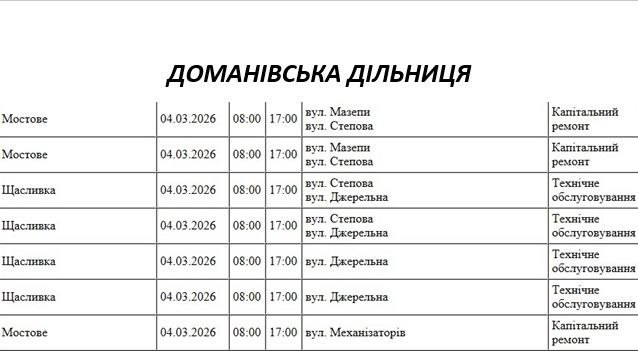 Графік відключення світла по адресах 4 березня, Доманівська дільниця АТ «Миколаївобленерго»