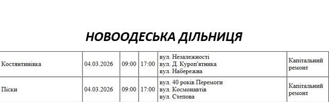 Графік відключення світла по адресах 4 березня, Новоодеська дільниця АТ «Миколаївобленерго»