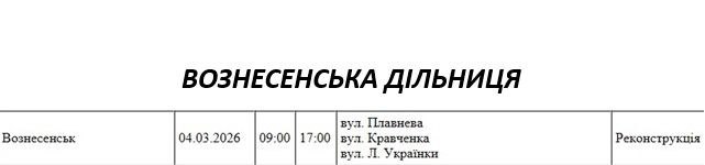Графік відключення світла по адресах 4 березня, Вознесенська дільниця АТ «Миколаївобленерго»