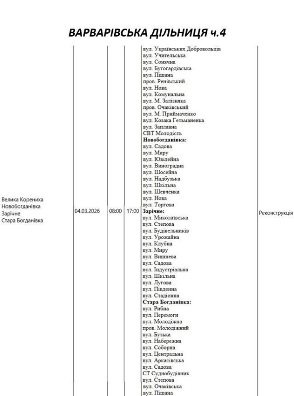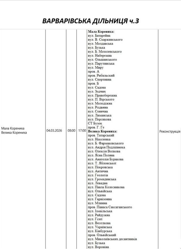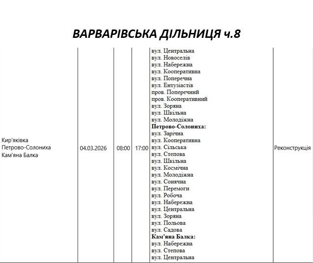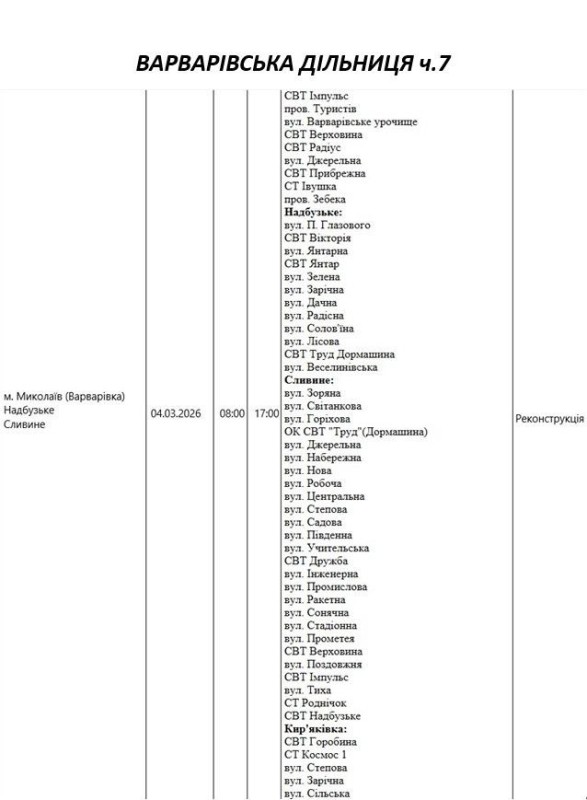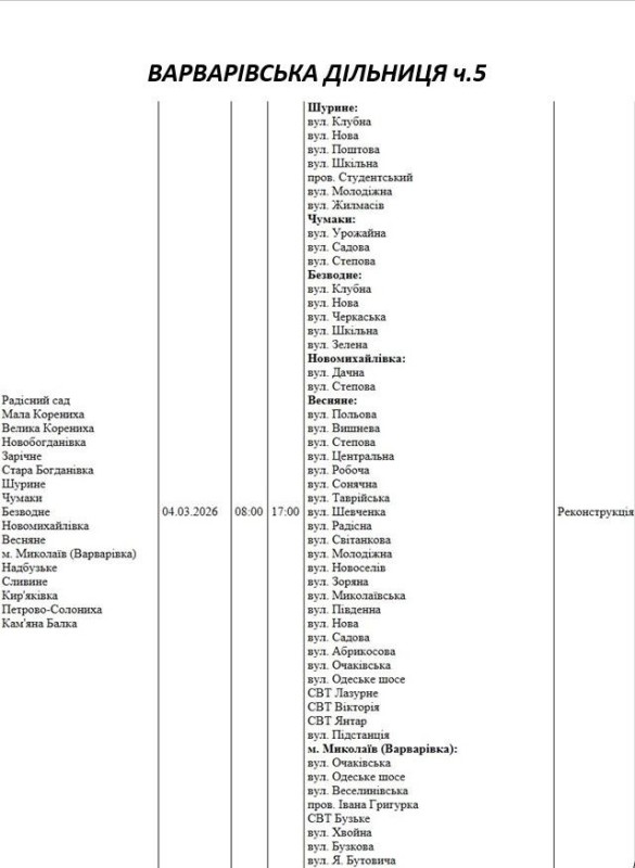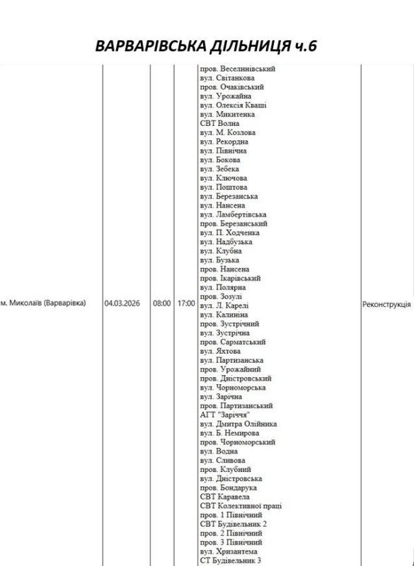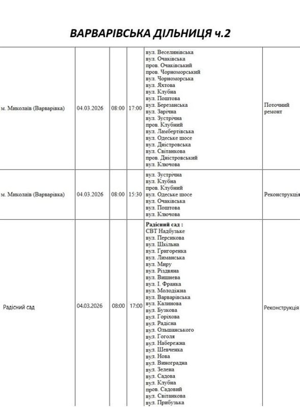 Графік відключення світла по адресах 4 березня, Варварівська дільниця АТ «Миколаївобленерго»