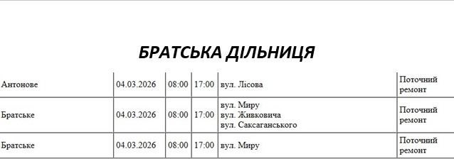 Графік відключення світла по адресах 4 березня, Братська дільниця АТ «Миколаївобленерго»