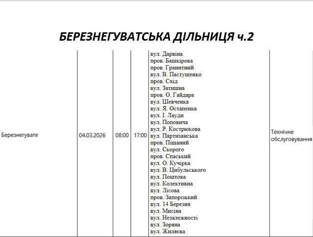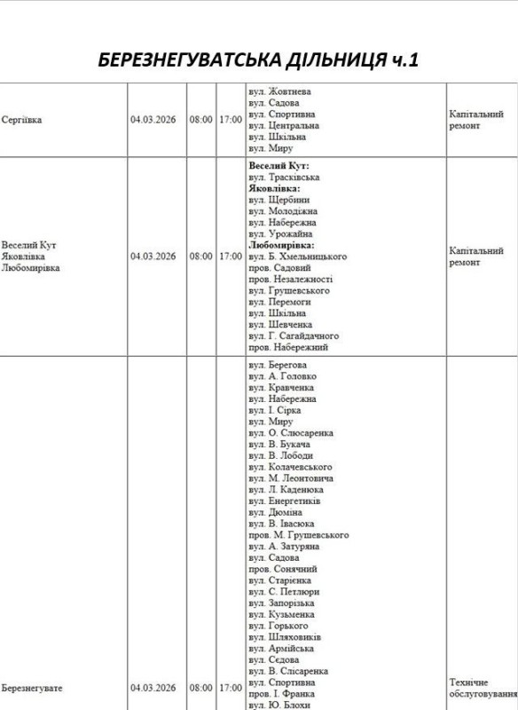 Графік відключення світла по адресах 4 березня, Березнегуватська дільниця АТ «Миколаївобленерго»
