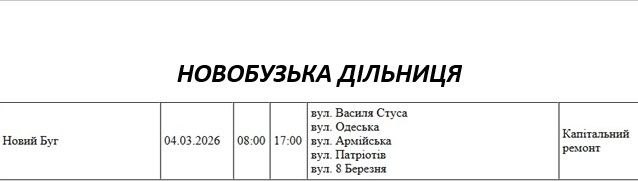 Графік відключення світла по адресах 4 березня, Новобузька дільниця АТ «Миколаївобленерго»
