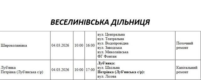 Графік відключення світла по адресах 4 березня, Веселинівська дільниця АТ «Миколаївобленерго»