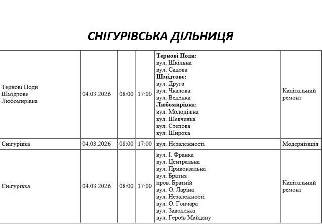Графік відключення світла по адресах 4 березня, Снігурівська дільниця АТ «Миколаївобленерго»