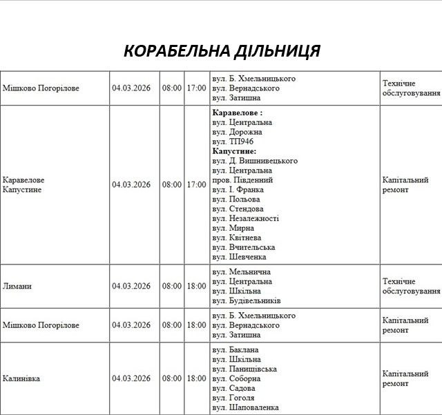 Графік відключення світла по адресах 4 березня, Корабельна дільниця АТ «Миколаївобленерго» Варварівська дільниця