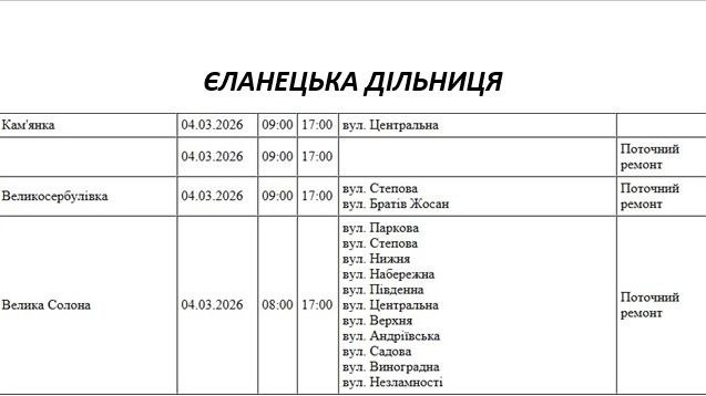 Графік відключення світла по адресах 4 березня, Єланецька дільниця АТ «Миколаївобленерго»