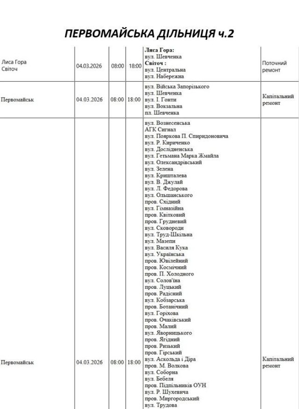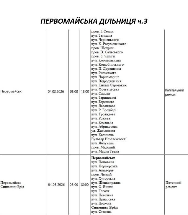 Графік відключення світла по адресах 4 березня, Первомайська дільниця АТ «Миколаївобленерго»