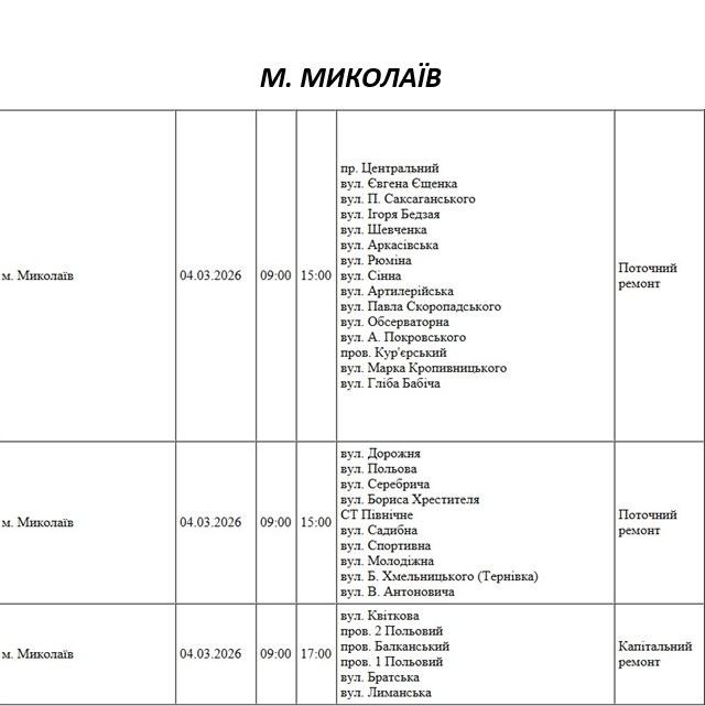 Графік відключення світла по адресах 4 березня, Миколаївська дільниця АТ «Миколаївобленерго»