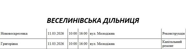 Графік відключення світла по адресах 11 березня, Веселинівська дільниця АТ «Миколаївобленерго»