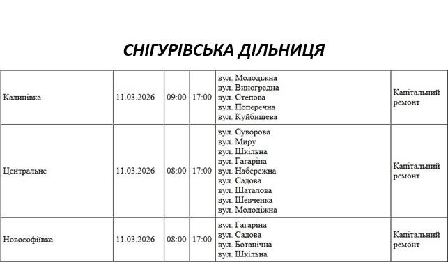 Графік відключення світла по адресах 11 березня, Снігурівська дільниця АТ «Миколаївобленерго»