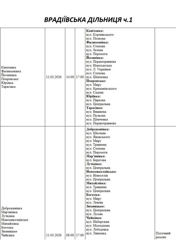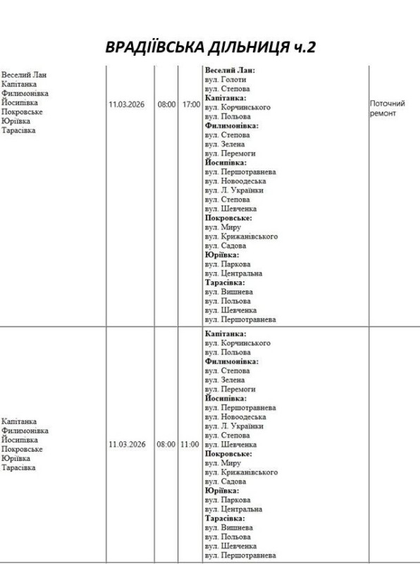 Графік відключення світла по адресах 11 березня, Врадіївська дільниця АТ «Миколаївобленерго»