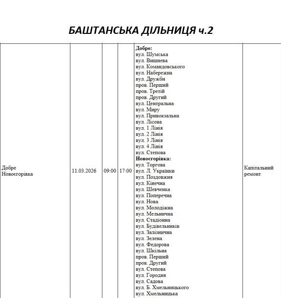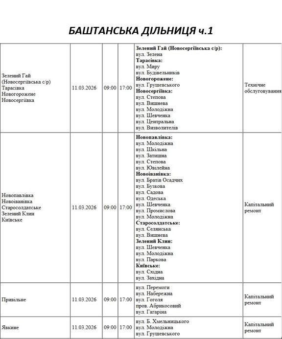 Графік відключення світла по адресах 11 березня, Баштанська дільниця АТ «Миколаївобленерго»