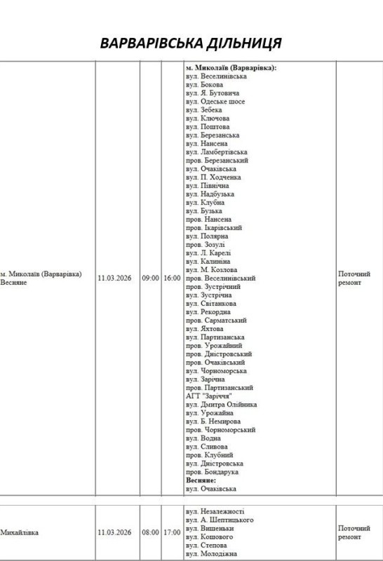 Графік відключення світла по адресах 11 березня, Варварівська дільниця АТ «Миколаївобленерго» Баштанська дільниця