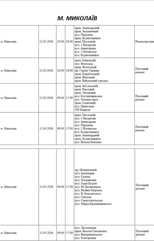 Графік відключення світла по адресах 11 березня, Миколаївська дільниця АТ «Миколаївобленерго»